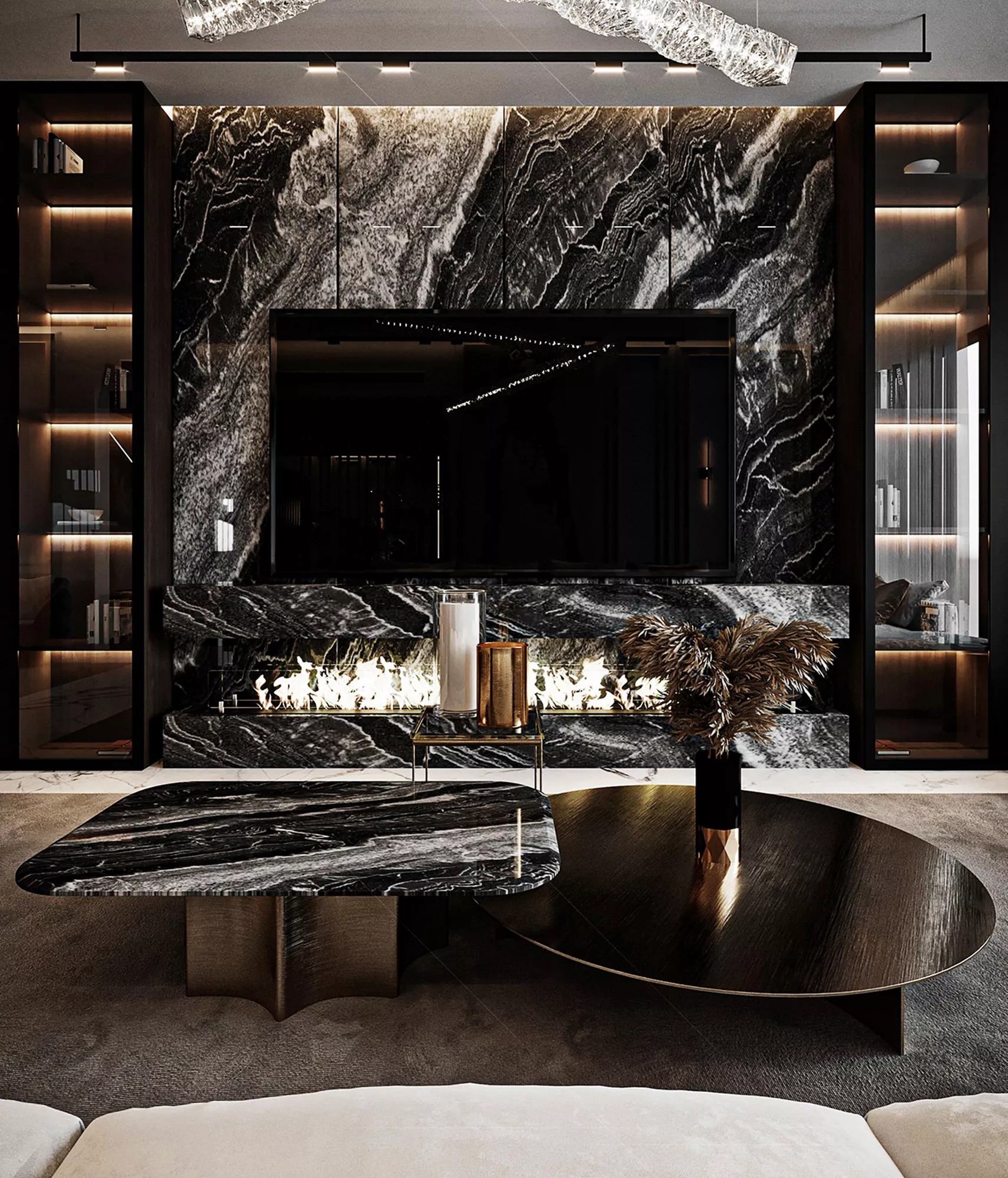 في بعض الأمثلة، تظهر عروق ذهبية أیضًا، مما یُضفي لمسةً من الفخامة على الواجهة. یُعد من أكثر الخيارات شيوعًا للمساحات ذات الطابع الداكن والثقيل. الاستخدامات المقترحة: