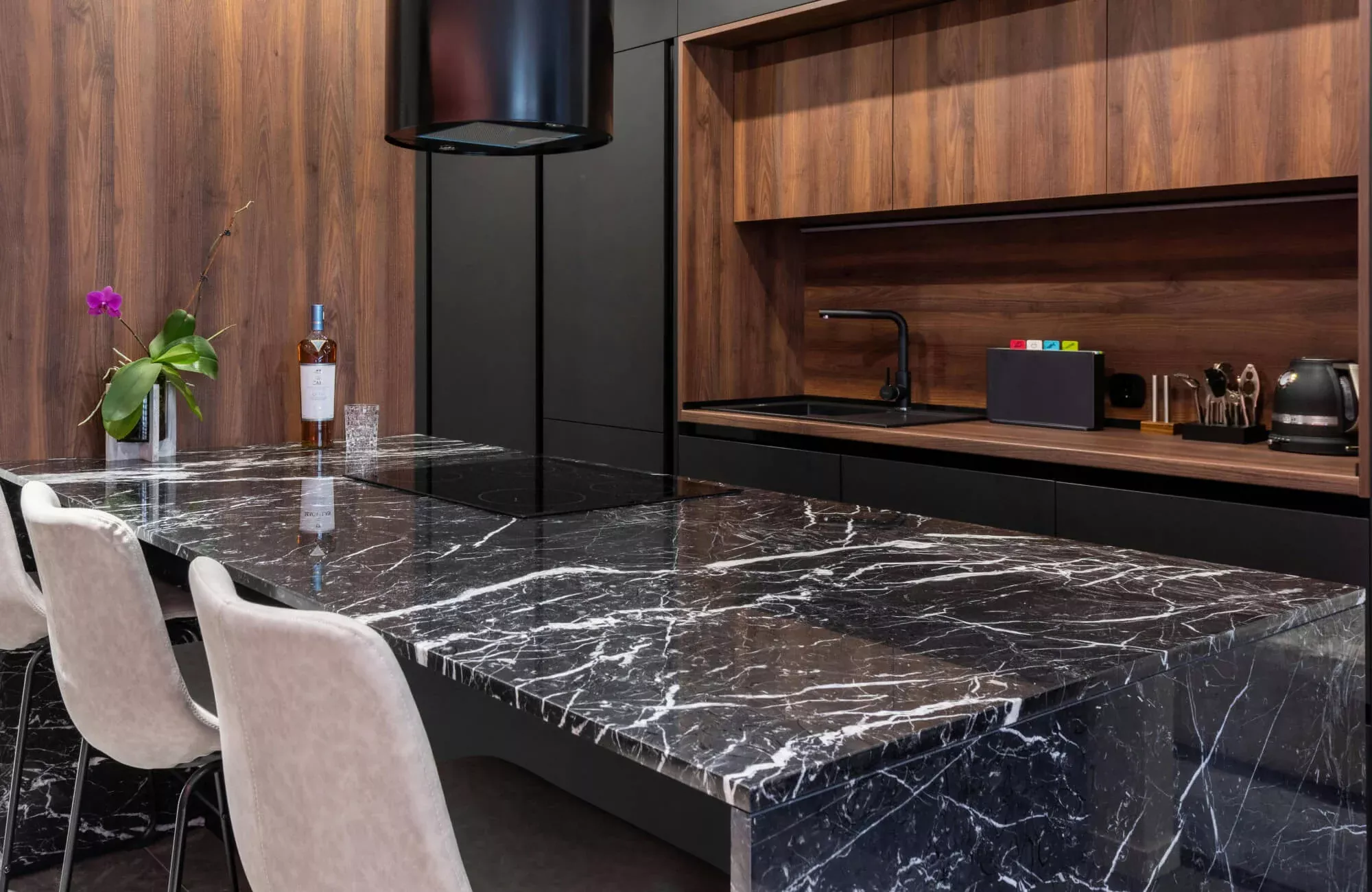 بخلفيته السوداء وعروقه الذهبية والبيضاء، یُعدّ رخام M 211 من أكثر الأحجار الفاخرة تميزًا وجاذبية.