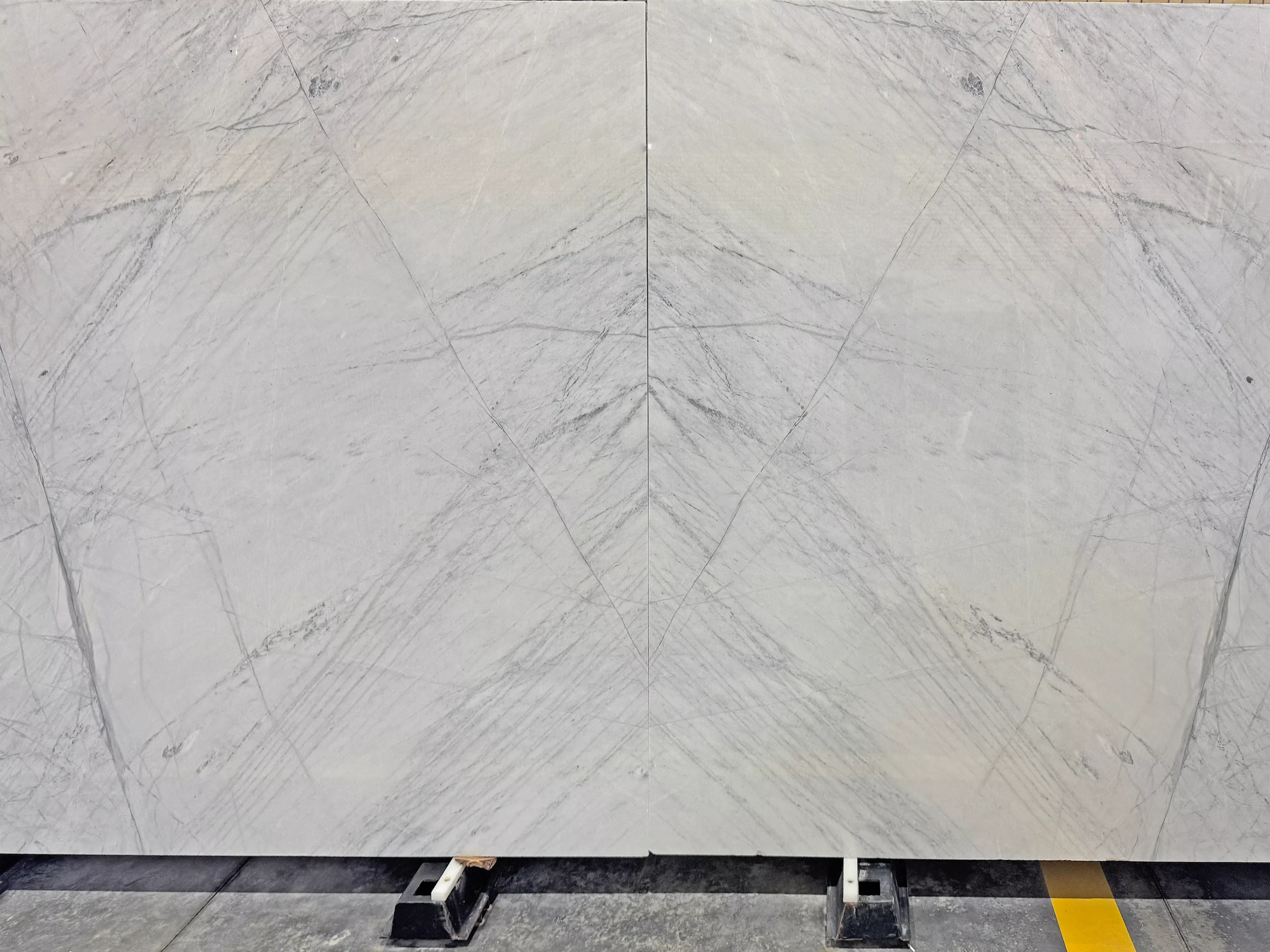 M 203 marble, with a white background and gray and cream veins, is a combination of simplicity and elegance which blends beautifully with subtle lighting to create a timeless, relaxed atmosphere.